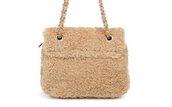 Met zijn zachte teddy afwerking voelt dit tasje niet alleen heerlijk aan, maar is het ook een echte eyecatcher. De flap wordt afgesloten met een elegante draaisluiting, wat je spullen veilig houdt en een vleugje verfijning toevoegt. Verder heeft het tasje een metaal PU band.
