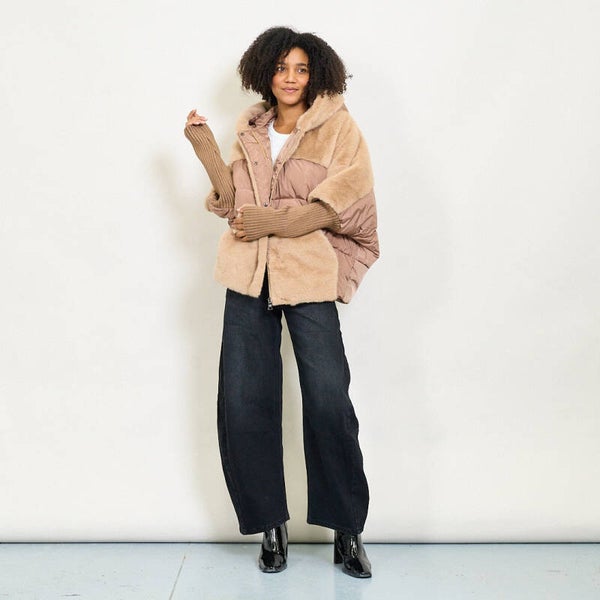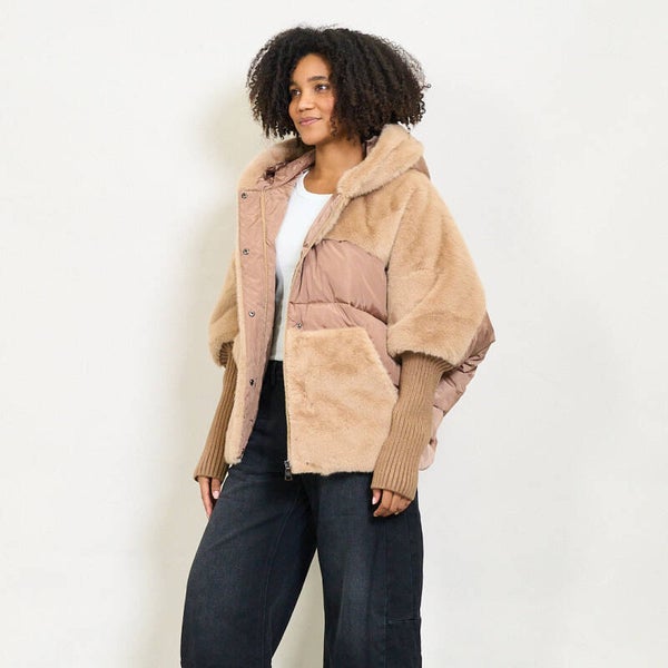 Faux vacht met capuchon en opgevulde gemengde jas.