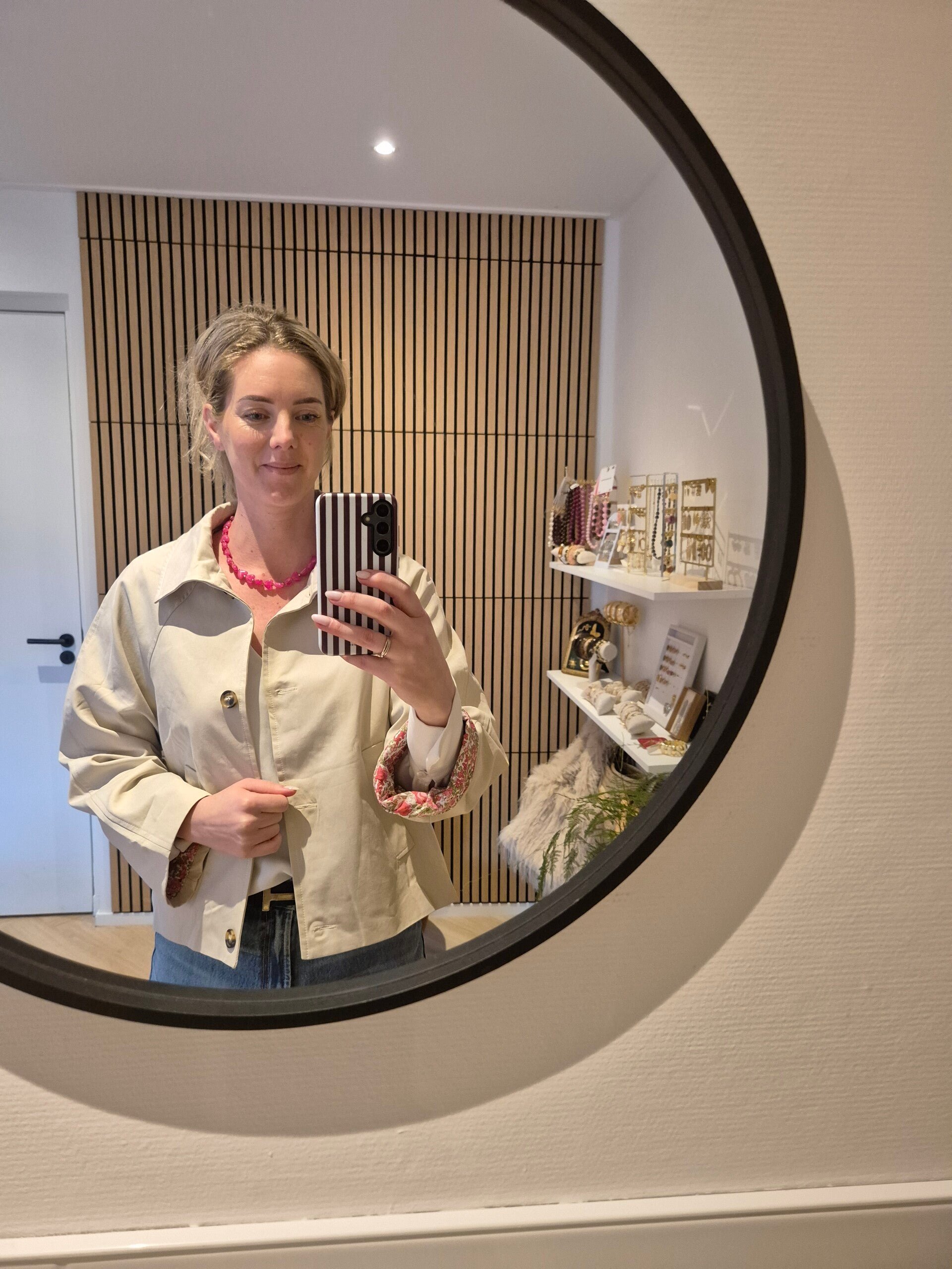 Leuk trenchcoat jasje. Met als binnenvoering een bloemetjespatroon, leuk als je de mouwen een klein stukje omslaat, geeft een mooi effect!